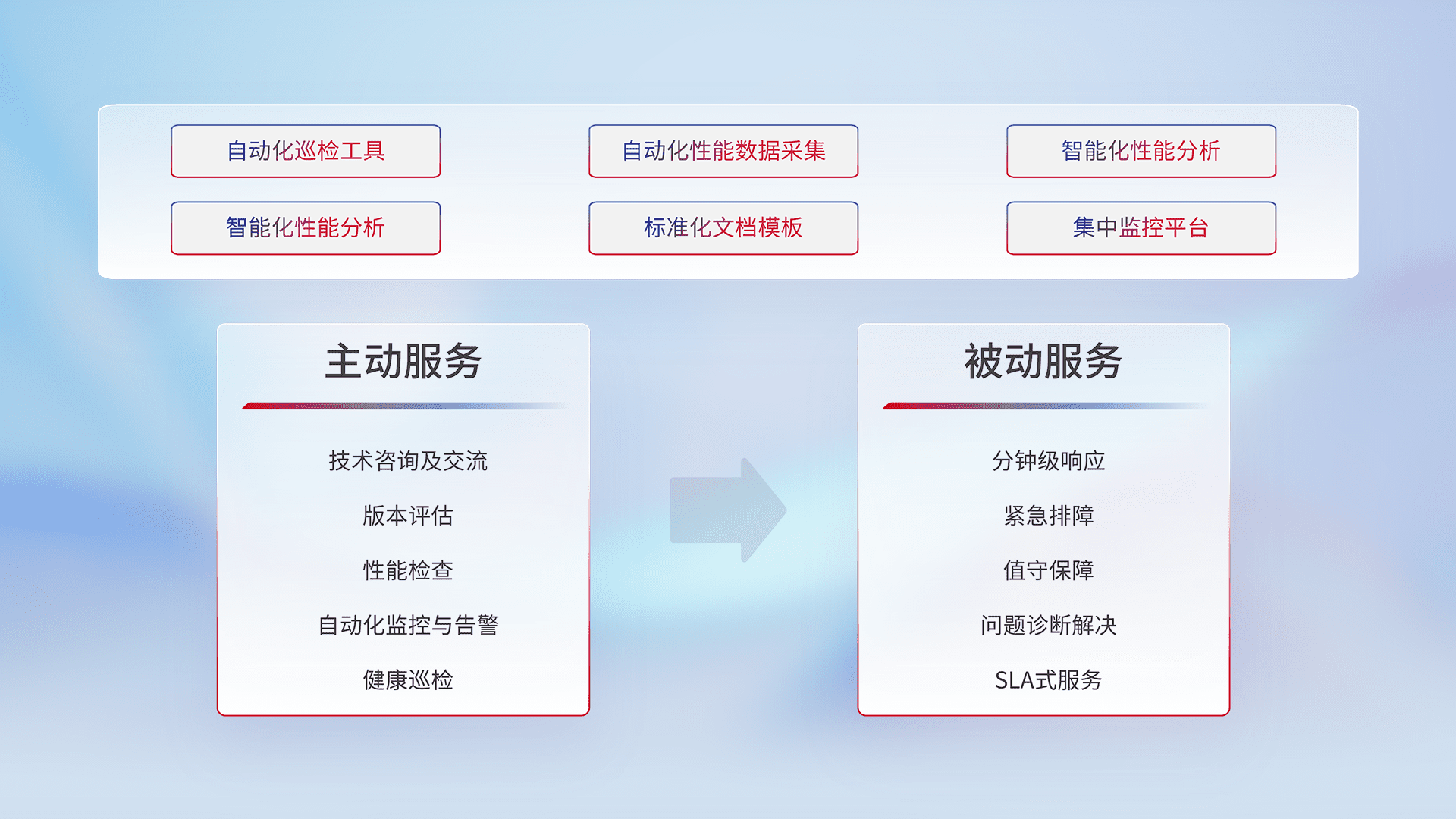 智能化工具和标准化文档,,保障服务质量,,,提供主动服务(包含技术咨询、、、、版本评估、、、性能检查、、自动化监控与告警、、健康巡检)和被动服务包含(分钟级响应、、、紧急排障、、值守保障、、、、问题诊断解决、、SLA服务)。。